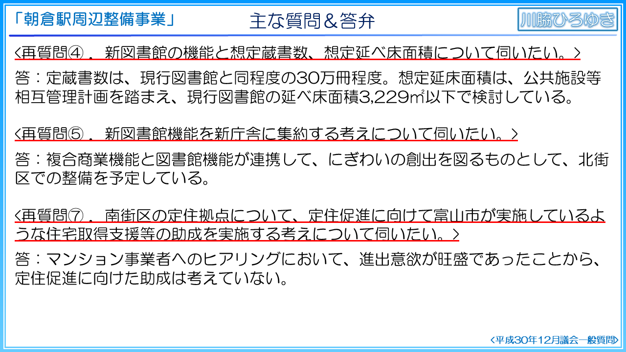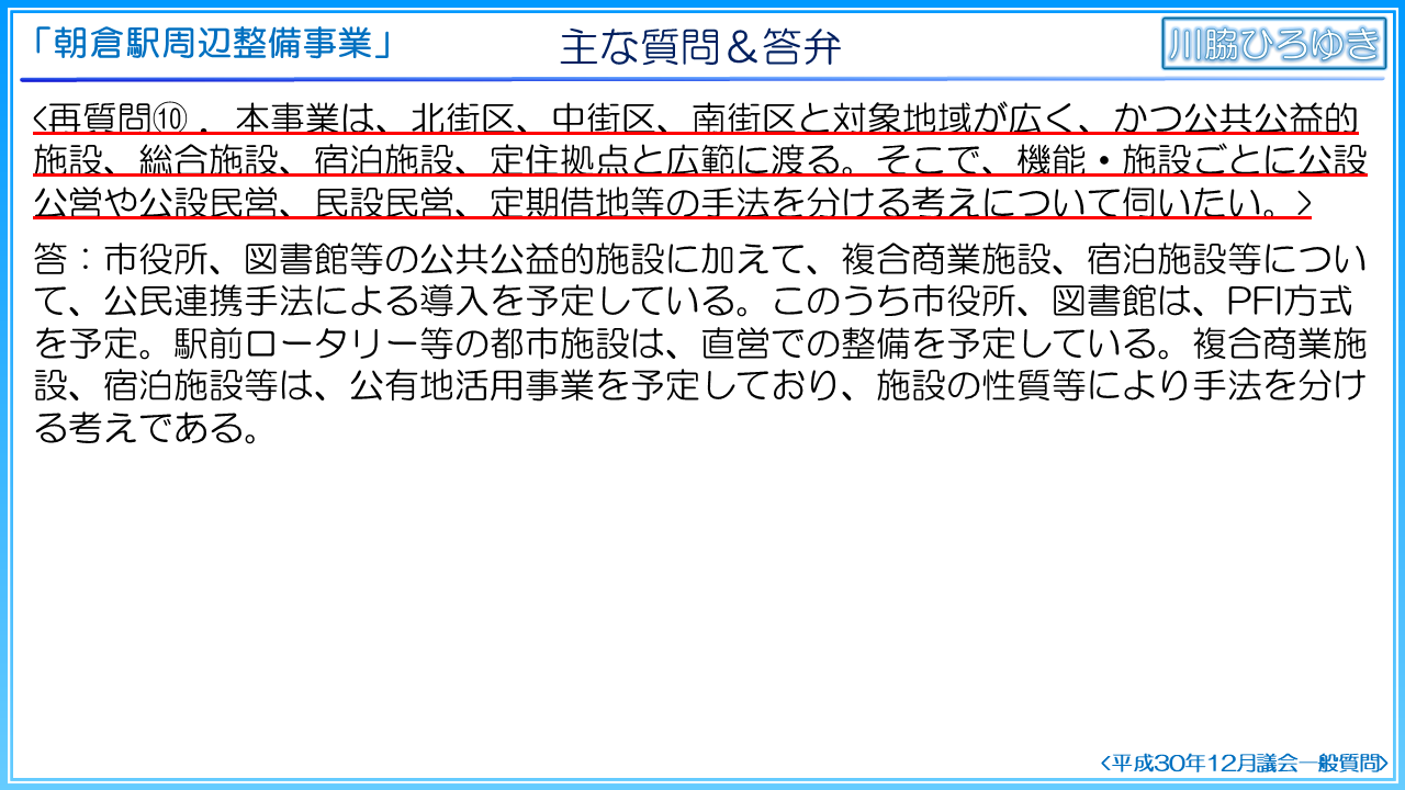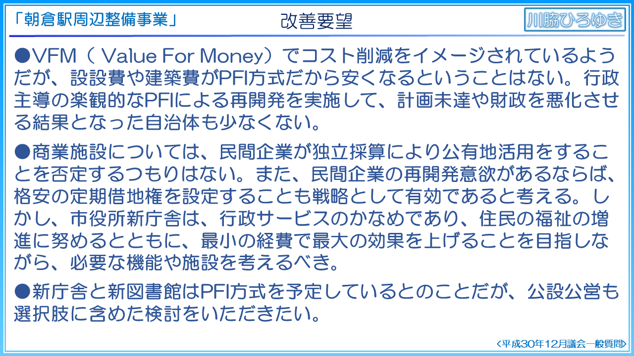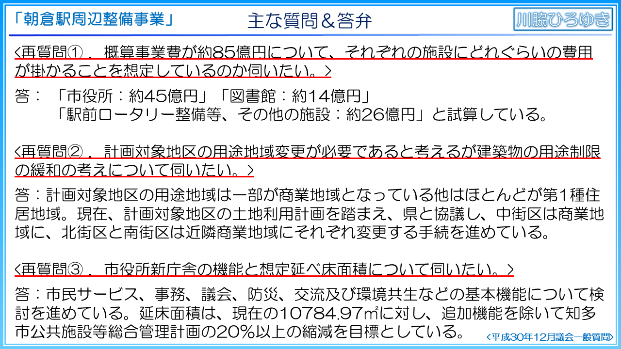 繰り返し確認しましたが、朝倉駅周辺整備事業は、実施方針等の公表内容から大きく内容が変更されます。基本構想と実施方針では、PFIで民間事業者に提案させるとしていたことから、新庁舎の立地の検証が実施されておりませんし、規模については、基本計画から増床するとしております。職員用駐車場数、来庁者用駐車場の配置案も示されておりません。他の自治体では新庁舎整備基本構想や基本計画でこれらの案や検証が実施されているのは一般的なことであり、必要不可欠な事項であると考えます。