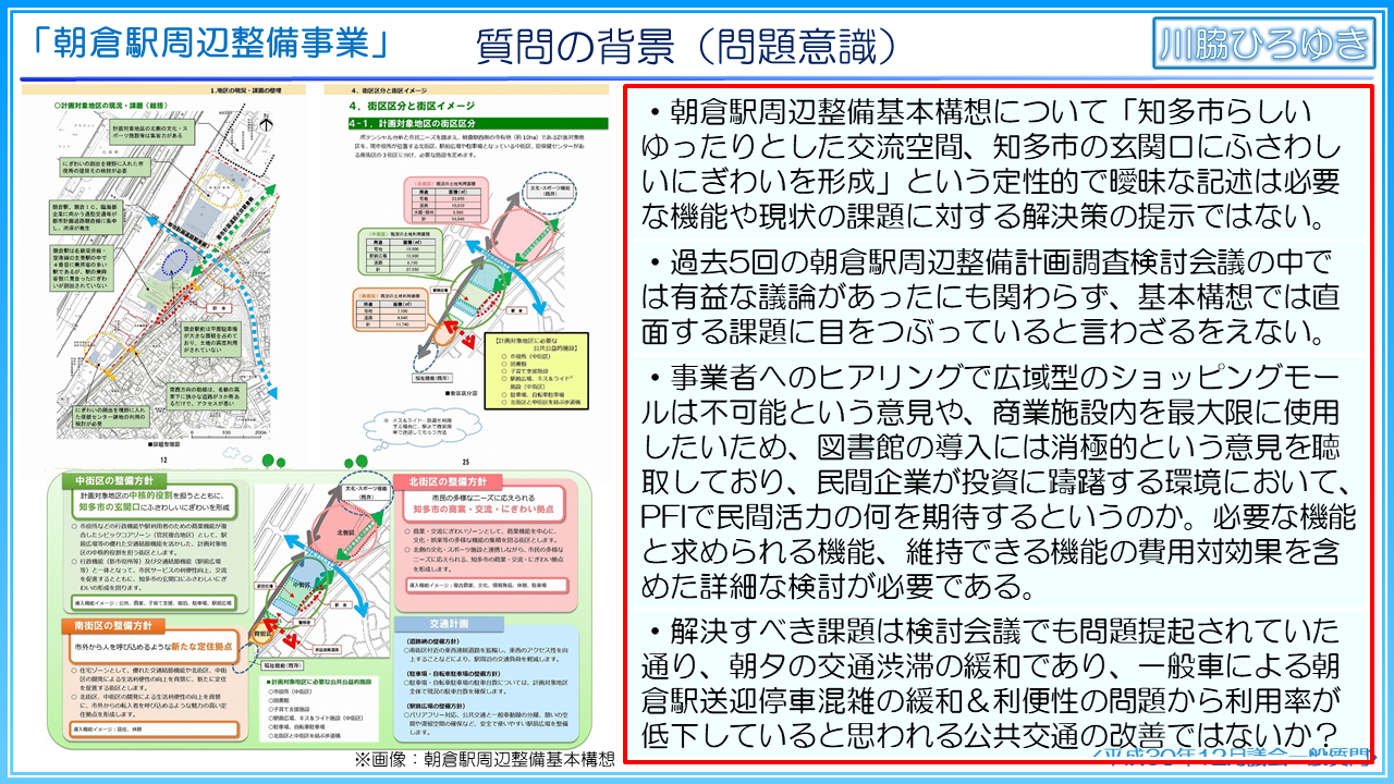 私は、2017年の朝倉駅周辺整備計画調査検討報告書の検証がないままに、朝倉駅周辺整備基本構想が策定されたことに懸念を抱き、そして基本構想のあまりの品質の悪さに危機感を覚えたことから、これまでも一般質問で事業について問題提起を行い、平成30年度知多市一般会計予算、平成31年度知多市一般会計予算及び関連委託業務に反対してきました。同様に、朝倉駅周辺整備について、議会で審議すべきとの問題意識を持たれた市民の方の要望を受け、2018年、平成30年第1回定例会にて、朝倉駅周辺整備計画特別委員会の設置を求める請願を紹介議員として提出いたしましたが、ここにおられる議員を含む多くの反対により、請願は否決されました。市議会が市政の重要な事柄を審議せず、一体何の役割を果たすというのでしょう。