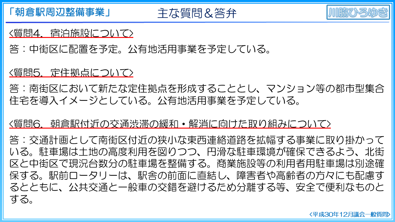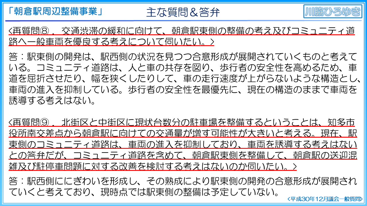 2016年、朝倉駅周辺整備計画調査検討会議が設置され、計5回の検討会議を実施。2017年8月、朝倉駅周辺整備計画調査検討報告書を公開。2018年3月、朝倉駅周辺整備基本構想を公開。そして2019年11月、朝倉駅前ロータリーが新しく生まれ変わりますと記者会見報道発表。2019年12月、朝倉駅前ロータリーの改良工事に令和2年度から着手しますとあさくらニュース19号にて情報発信。この間、議会では、2018年、平成30年3月の全員協議会で、朝倉駅周辺整備基本構想について報告。2019年、平成31年3月の全員協議会で、朝倉駅周辺整備事業の実施方針の考え方について報告。ここまでが事実関係の整理です。