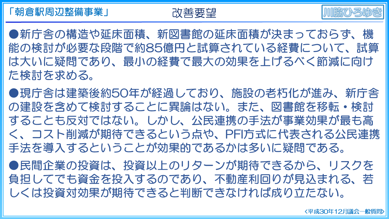 市役所新庁舎整備については、冒頭で申し上げた通り、私は新設移転に反対するものではありません。そして、移転先は市が保有する十分な土地があり利便性の高い場所である朝倉駅周辺整備基本構想の計画対象地区以外に現実的な候補はないものと理解しておりますが、その計画対象地区で精緻に検証を実施しなければならないと考えます。