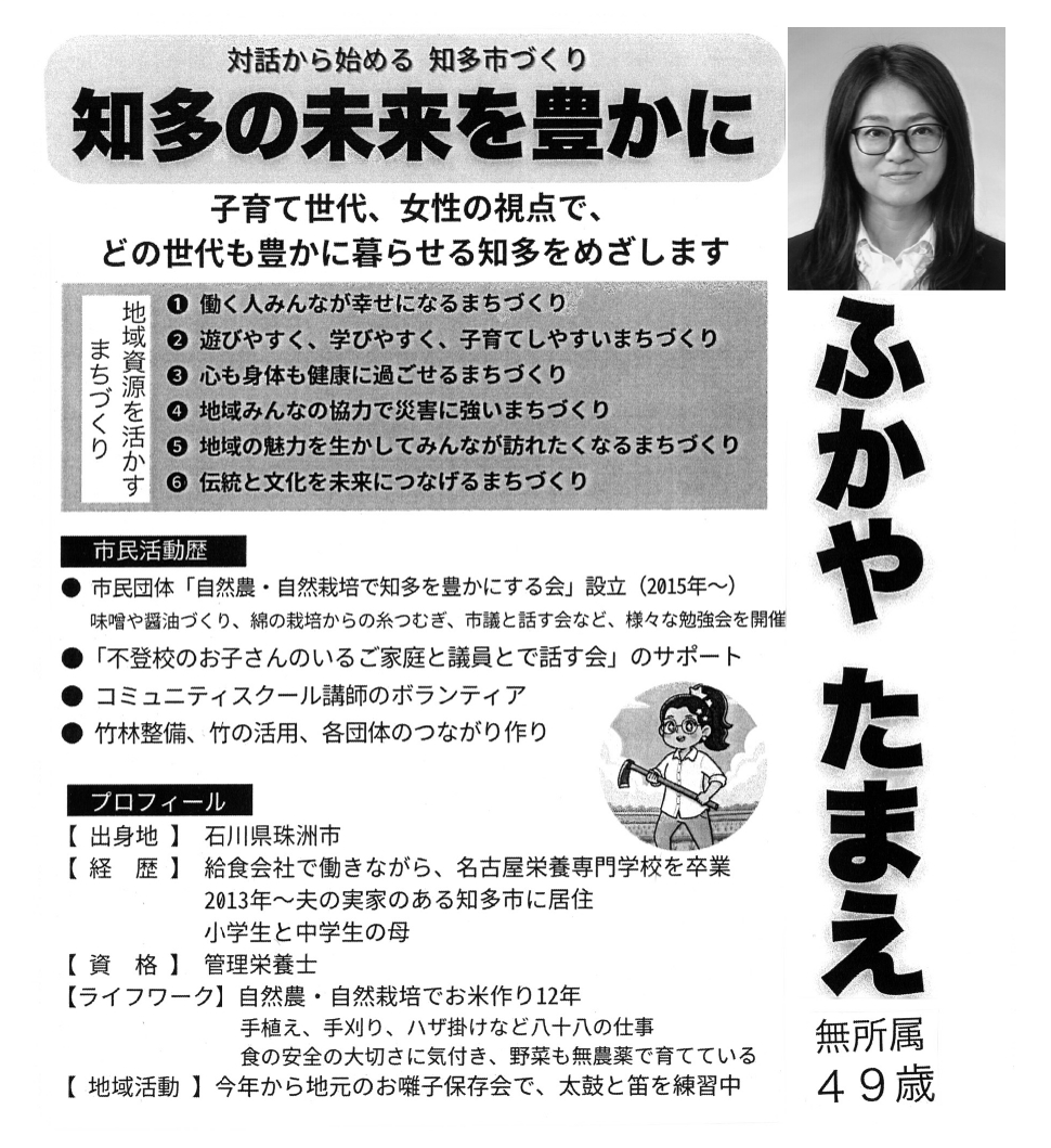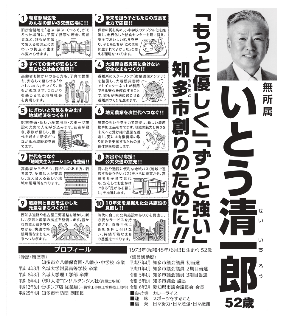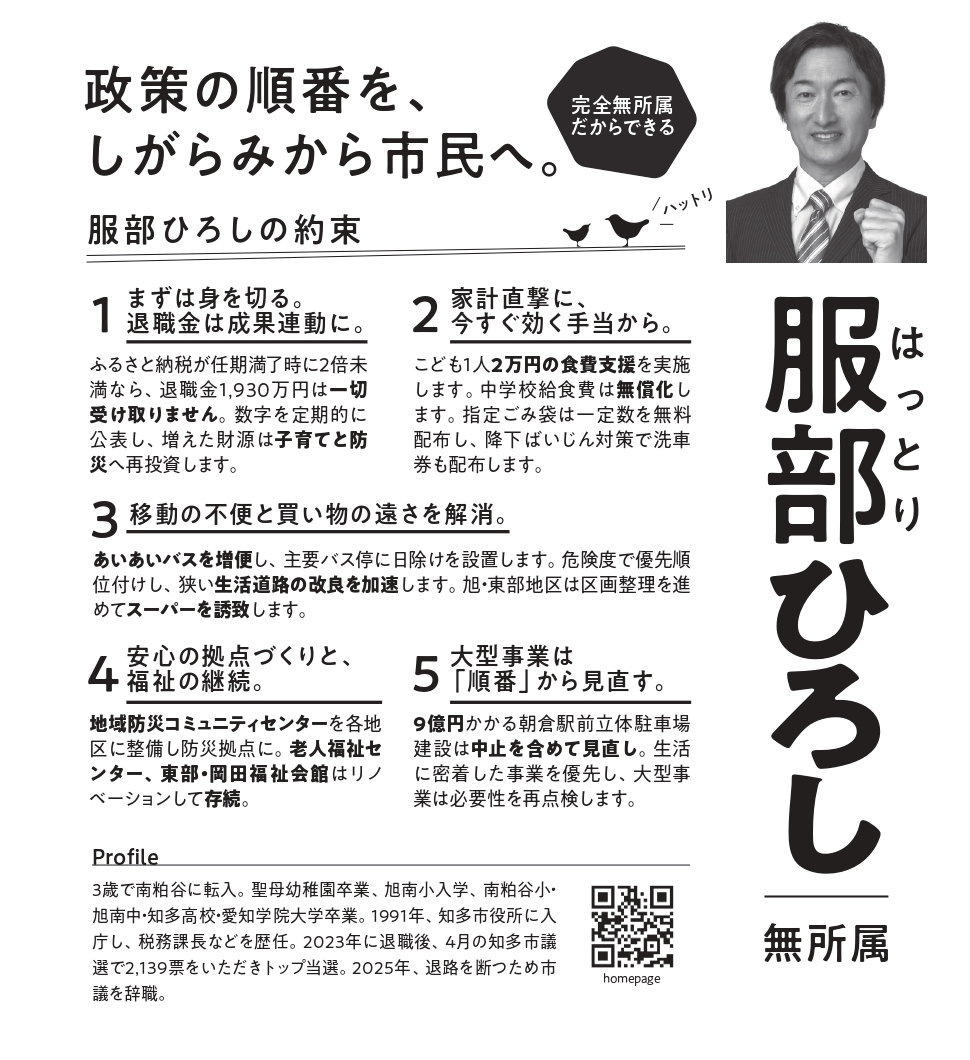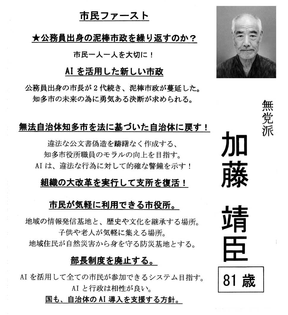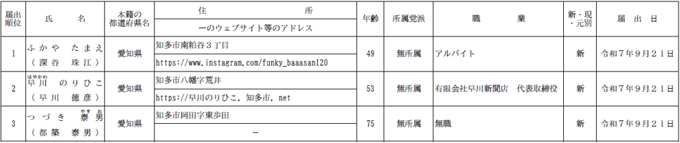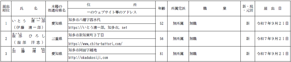 令和7年9月28日執行の「知多市長選挙」及び「知多市議会議員補欠選挙」が告示されました。現在、知多市ホームページに立候補者一覧や選挙公報がPDFにて公開されていますが、市民の皆さまから「情報が分かりにくい」とのお声をいただきました。そこで、本ページでは内容を抜粋し、できるだけ見やすく整理して掲載いたします。