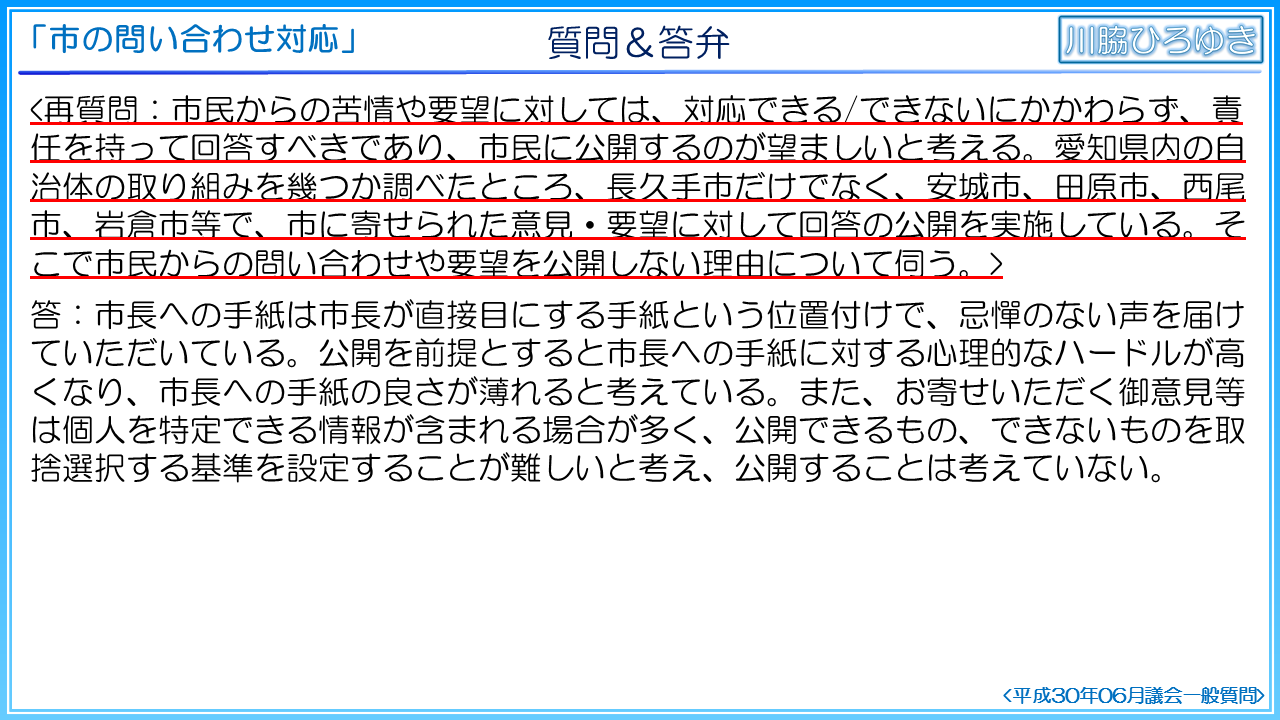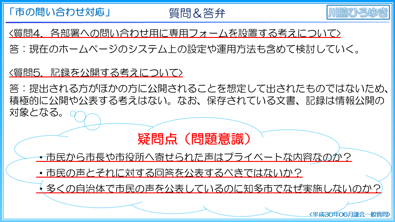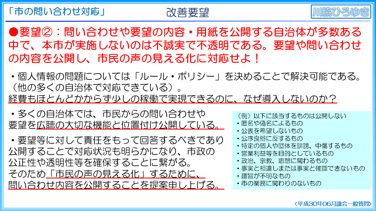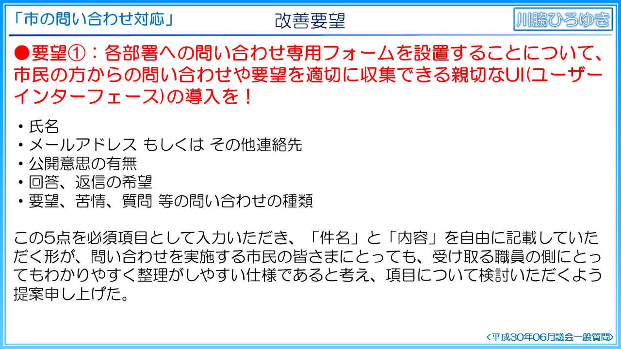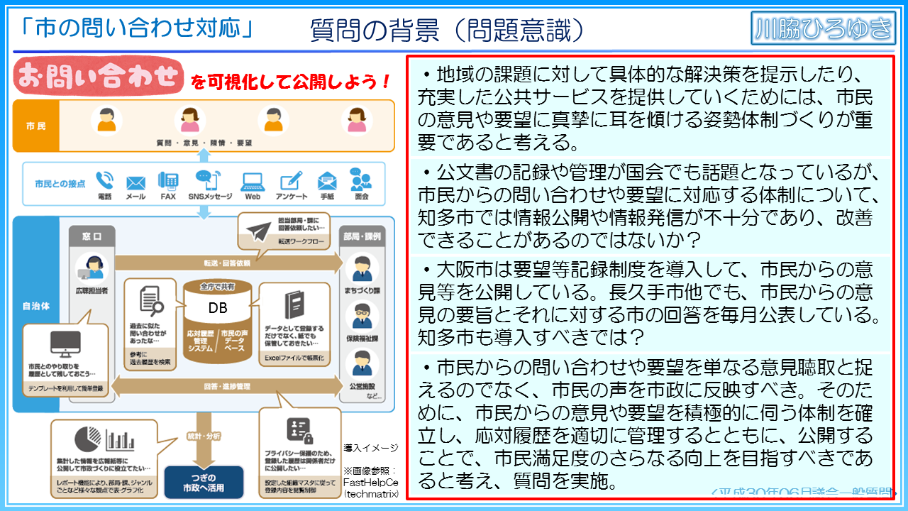そこで、市民からの問い合わせや要望等の記録と対応について、市民からの意見や要望を積極的に伺う体制を確立し、応対履歴を適切に管理するとともに、公開することで市民満足度のさらなる向上を目指すべきであるという問題意識に基づき、一般質問を実施し、改善提案を実施いたしました。