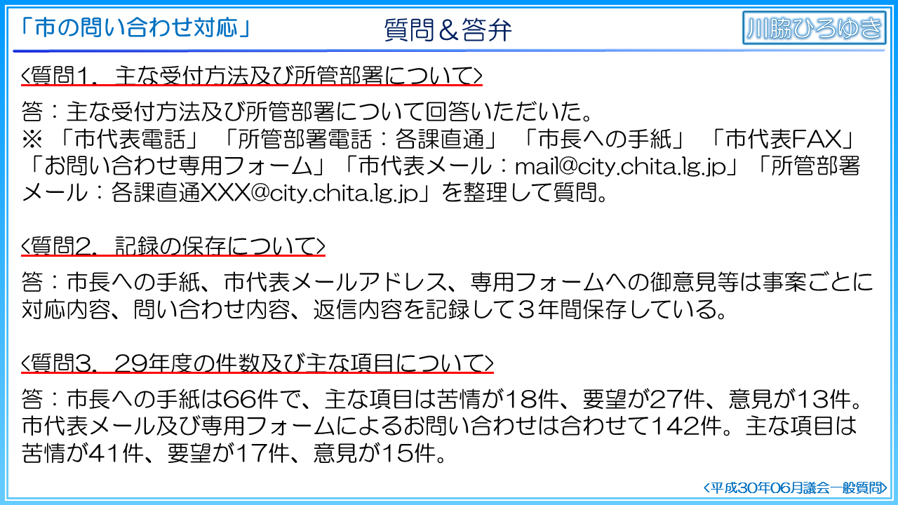 1点目、主な受付方法及び所管部署について、2点目、記録の保存について、3点目、29年度の件数及び主な項目について、4点目、各部署への問い合わせ用に専用フォームを設置する考えについて、5点目、記録を公開する考えについて、以上をお伺いして、壇上からの質問といたします。答弁よろしくお願いいたします。