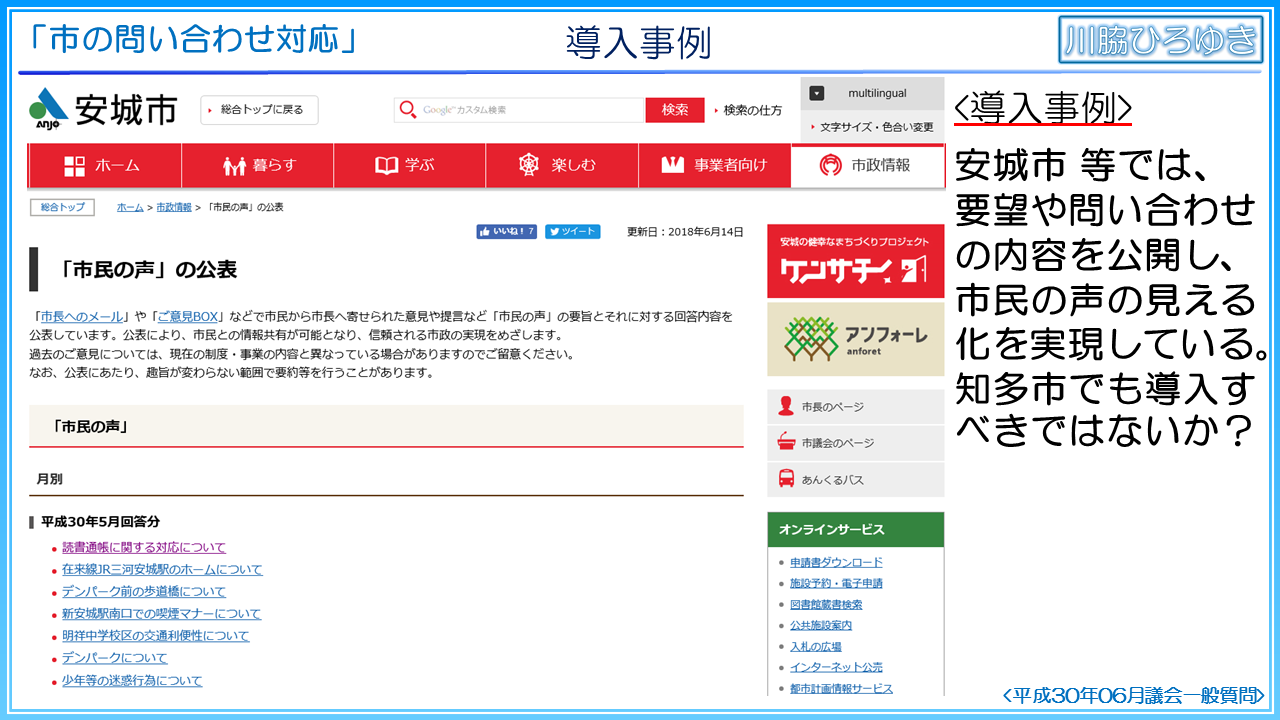 知多市は市役所に限らず行政に対する要望・苦情・提案を公開しておらず、かつ、問い合わせの受付方法もバラバラで、市民の声に真摯に耳を傾けて市政に反映させる体制がとられていません。