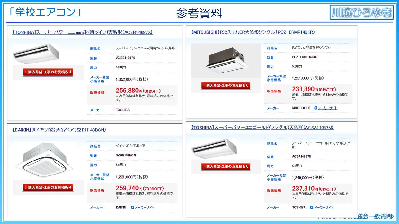 - 製造メーカーや販売会社など複数の企業へ見積もりを依頼して精査いただきたい。職員の皆さまも、自宅のエアコンを購入する際にはスペックや価格などを検討されるだろう。税金だから浪費しても良いという考えではなく、コスト意識を持っていただきたい。