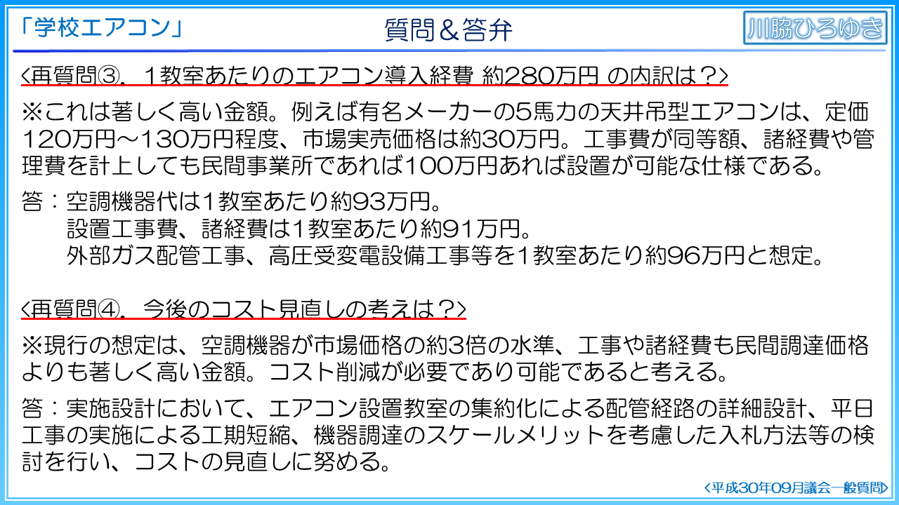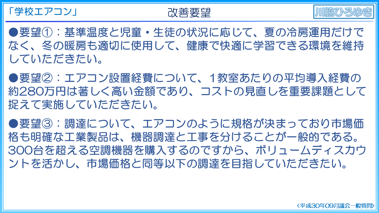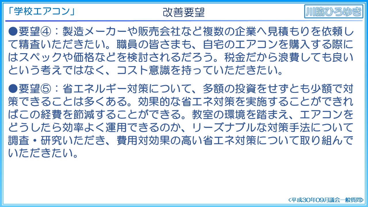 - エアコン設置経費について、1教室あたりの平均導入経費の約280万円は著しく高い金額であり、コストの見直しを重要課題として捉えて実施していただきたい。