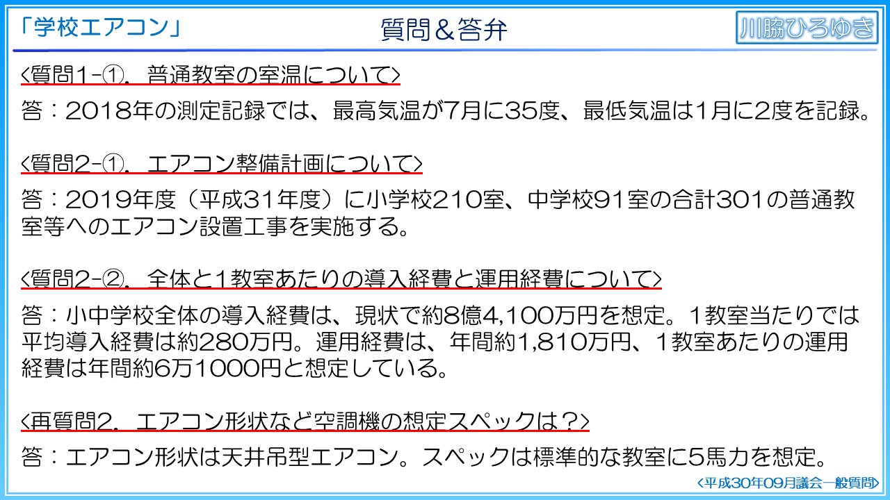 2018年12月議会で学校教室への空調設備整備工事費が補正予算として議案上程されましたので、本予算の問題点を洗い出すべく質問をいたしました。