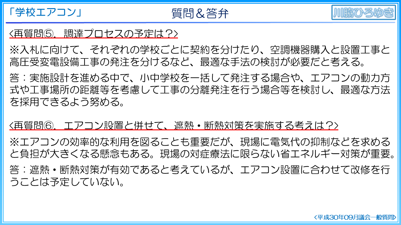 真夏日や猛暑日の教室は、学習に適した環境とは言えず、健康に害を及ぼしかねない環境である。その状況に対して、本市が中学校普通教室に加え、小学校普通教室へのエアコン設置を前倒しして来年度に実施する方針を示したことは、評価する。