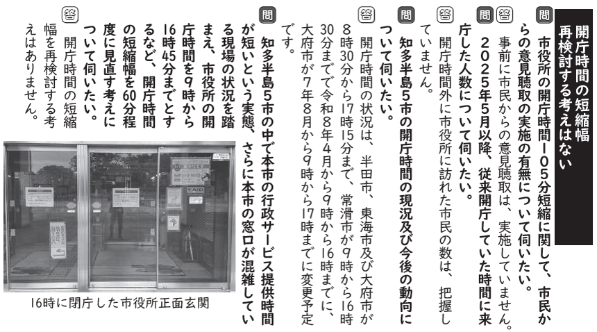 しかしながら、市は開庁時間短縮の見直しを行うことなく、3月末以降に、令和7年5月1日から開庁時間・電話受付時間を変更します。とホームページや広報ちた等で周知及び案内を実施し、5月1日から市役所の開庁時間が9時~16時に短縮されております。(※1)