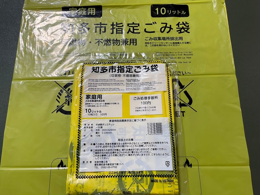 「10L 知多市指定ごみ袋」(小型サイズ)はドラッグストア等で購入できます(人気のため既に品切れ間近でした)。