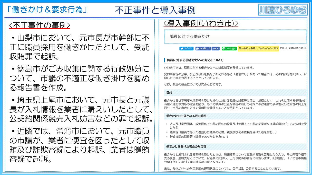 そして、毎年自治体と事業者が関係する不正が起きています。一例を挙げれば、山梨市において、元市長が市幹部に不正に職員採用を働きかけたとして、受託収賄罪で起訴。徳島市がごみ収集に関する行政処分について、市議の不適正な働きかけを認める報告書を作成。埼玉県上尾市において、元市長と元議長が入札情報を業者に漏えいしたとして公契約関係競売入札妨害などの罪で起訴。近隣では常滑市において、元市職員の市議が業者に便宜を図ったとして収賄及び詐欺容疑により起訴、業者は贈賄容疑で起訴など様々な事件が起きています。