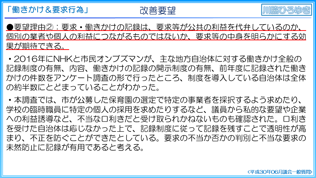 第2に、要求・働きかけの記録は、要求等が公共の利益を代弁しているのか、個別の業者や個人の利益につながるものではないか、要求等の中身を明らかにする効果が期待できます。先に挙げたNHKと市民オンブズマンが実施した調査では、市が公募した保育園の選定で特定の事業者を採択するよう求めたり、学校の臨時職員に特定の個人の採用を求めたりするなど、議員から私的な要望や企業への利益誘導など、不当な口ききだと受け取られかねないものも確認されたとのことです。口ききを受けた自治体は応じなかった上で、記録制度に従って記録を残すことで透明性が高まり、不正を防ぐことができたとしています。要求の不当か否かの判別と不当な要求の未然防止に記録が有用であると考えます。