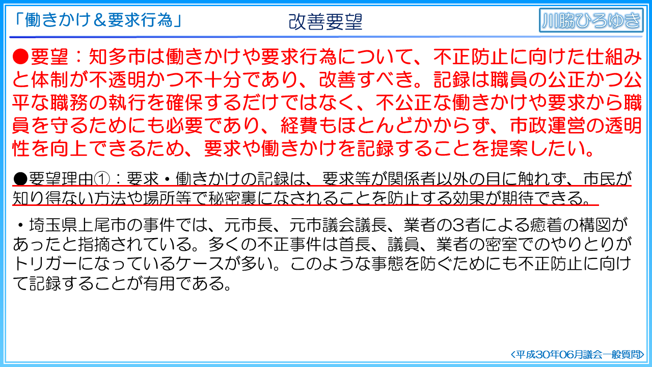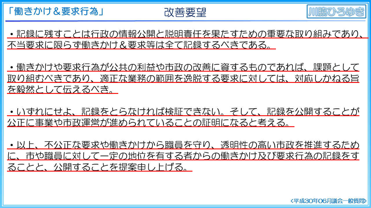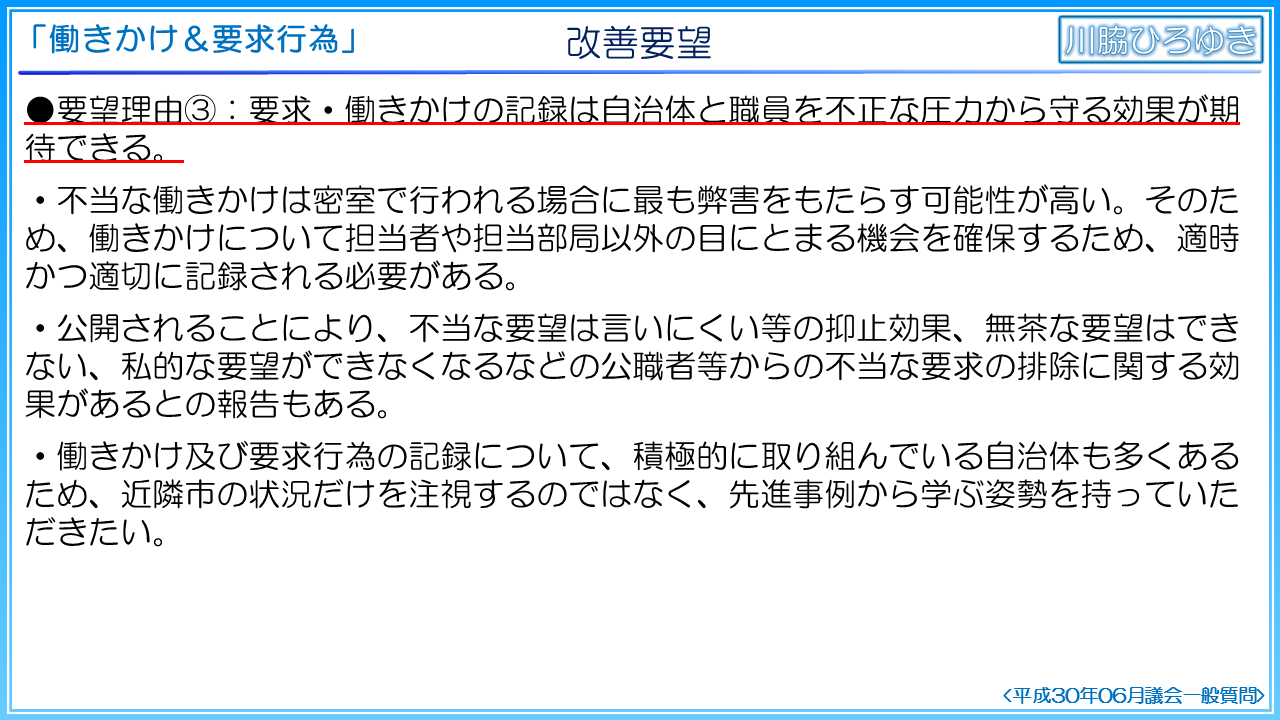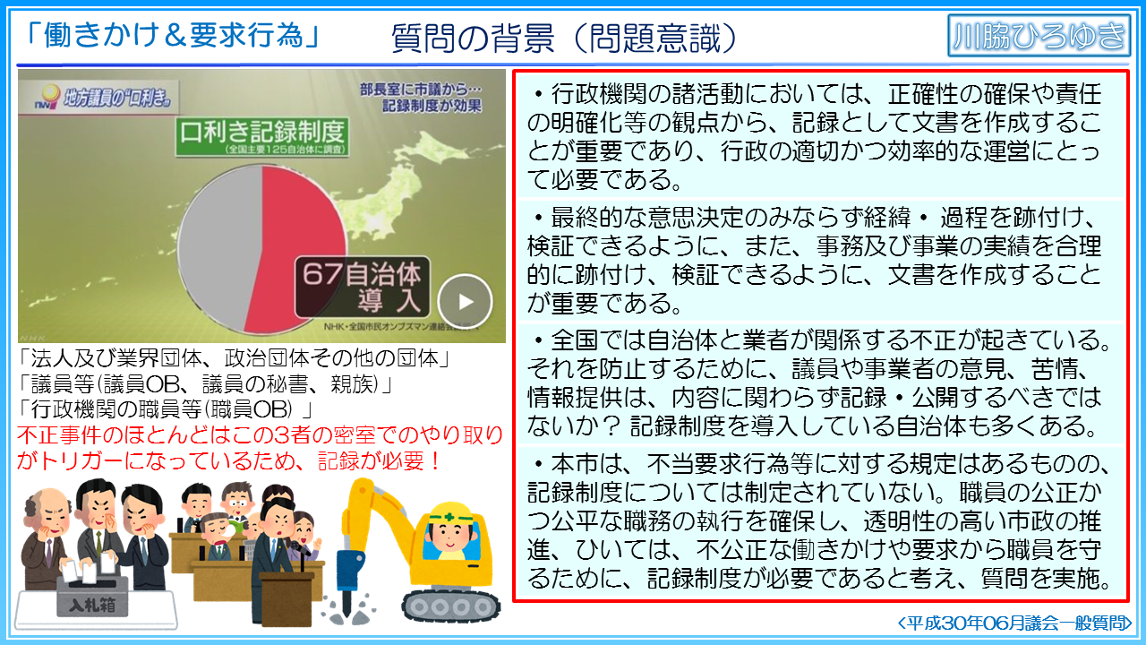 そこで、職員の公正かつ公平な職務の執行を確保し、透明性の高い市政の推進、ひいては、不公正な働きかけや要求から職員を守るために、記録制度が必要であると考えて問題点を洗い出し、改善に向けての提案を実施しました。
