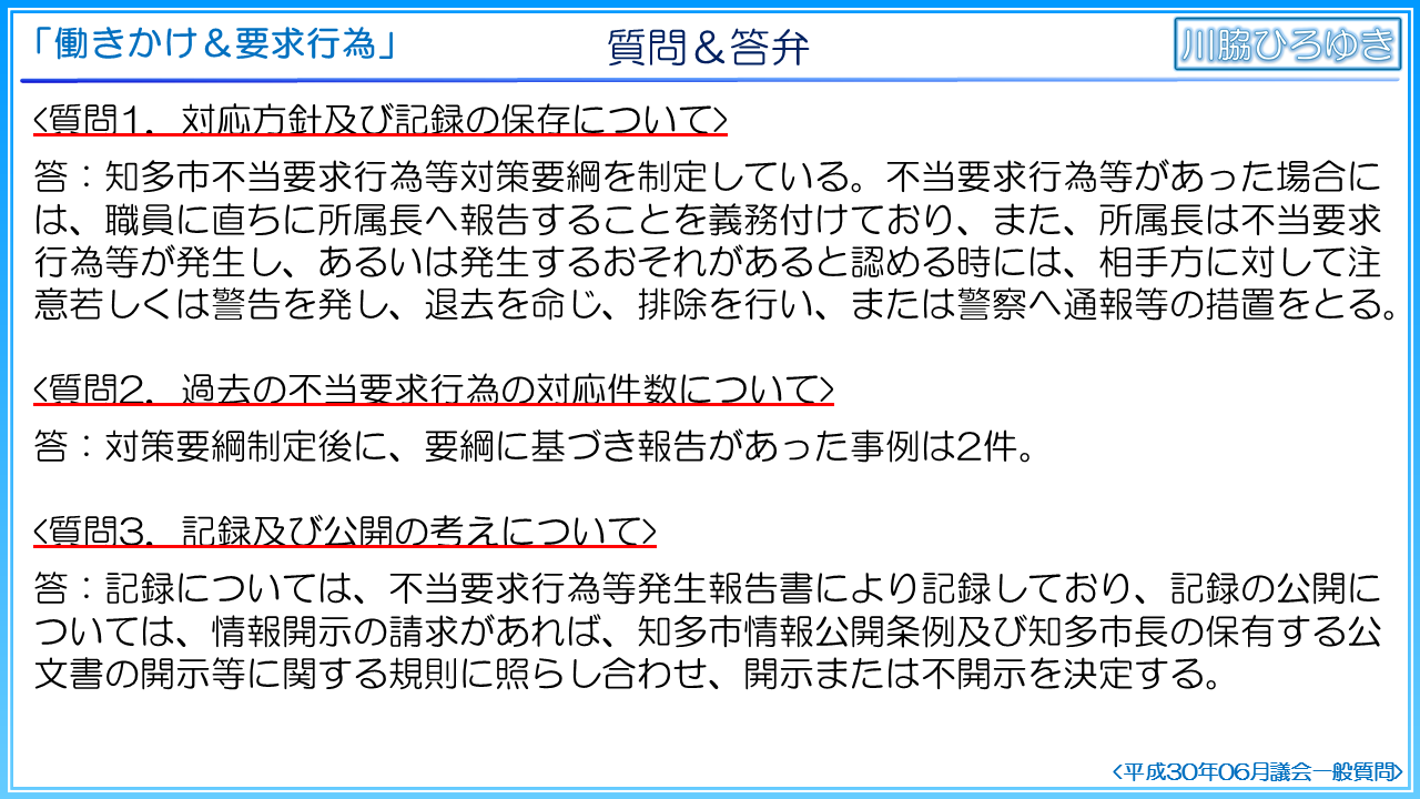 1点目、対応方針及び記録の保存について、2点目、過去の不当要求行為の対応件数について、3点目、記録及び公開の考えについて、以上よろしくお願いいたします。