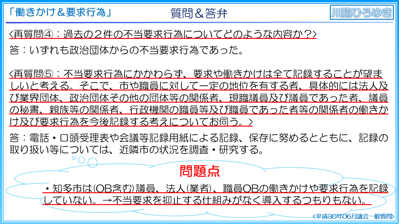 不正事件は首長、議員、業者の密室でのやり取りがトリガーになっているケースがほとんどであり、知多市でも議員から私的な要望や、特定の事業者への利益誘導を促しているような働きかけなどを目にしたり、耳にする機会があります。しかし、それらは記録されておりません。なぜなら本市は、不当要求行為等に対する規定はあるものの、記録制度については制定されていないためです。