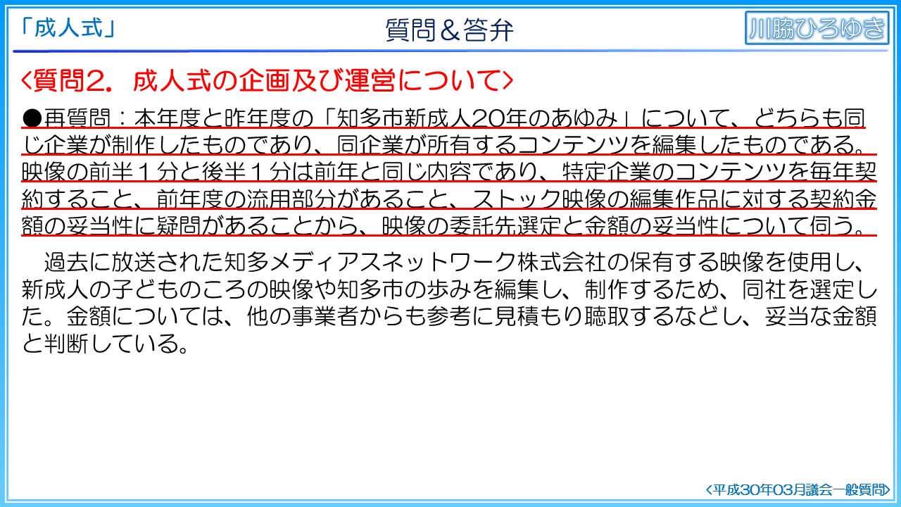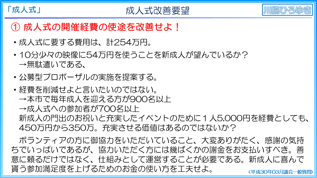 第1に、開催経費の使途改善を要望いたします。本年度成人式に要した費用は、計254万円です。このうち、会場借り上げ料以外は改善の余地が大きいと考えます。10分少々の映像に54万円を使うことを新成人が望んでいるでしょうか。新成人や学校が持つ記録データを持ち寄る自治体も多くあり、随意契約にも疑問です。