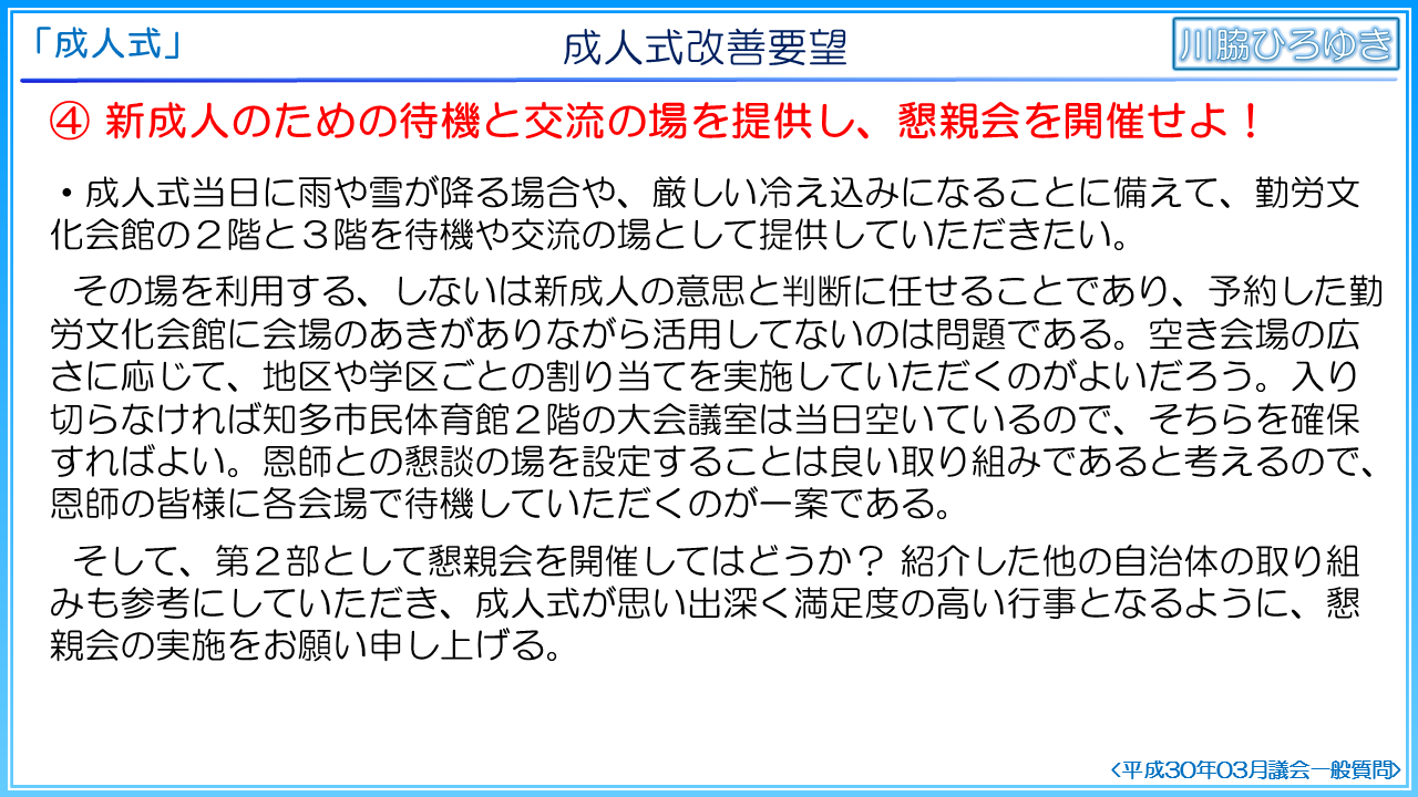 第4に、待機と交流の場の提供と懇親会の開催を提案いたします。成人式当日に雨や雪が降る場合や、厳しい冷え込みになることに備えて、勤労文化会館の2階と3階を待機や交流の場として提供していただきたく存じます。