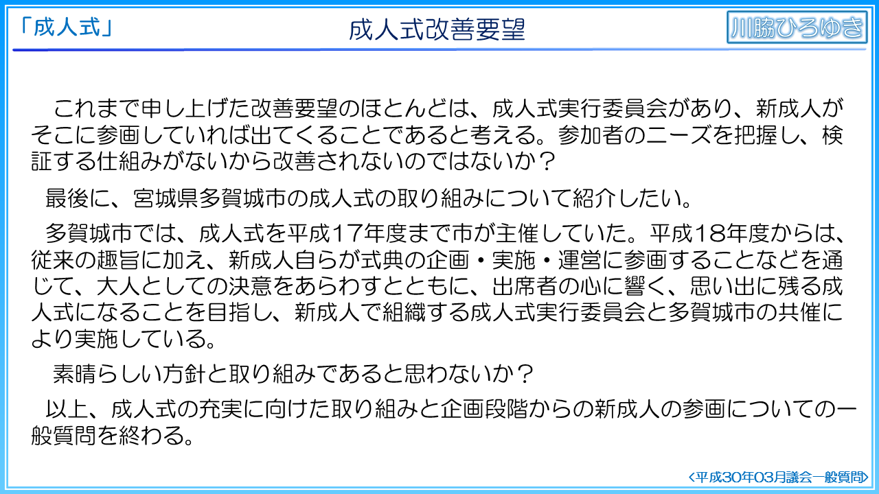 また、本市の成人式は、30分少々の式典とイベントコーナーの提供のみであり、式典とあわせて懇親会やティーパーティー等を開催したり記念録を制作する自治体に比べて内容が見劣りしていると考えます。そもそも、全国の多くの自治体で成人式実行委員会が組織され、新成人が企画段階から参画しているのに対して、本市では実行委員会も組織されておらず、主役である新成人の意見や要望を収集して反映される仕組みが機能していないと考えます。