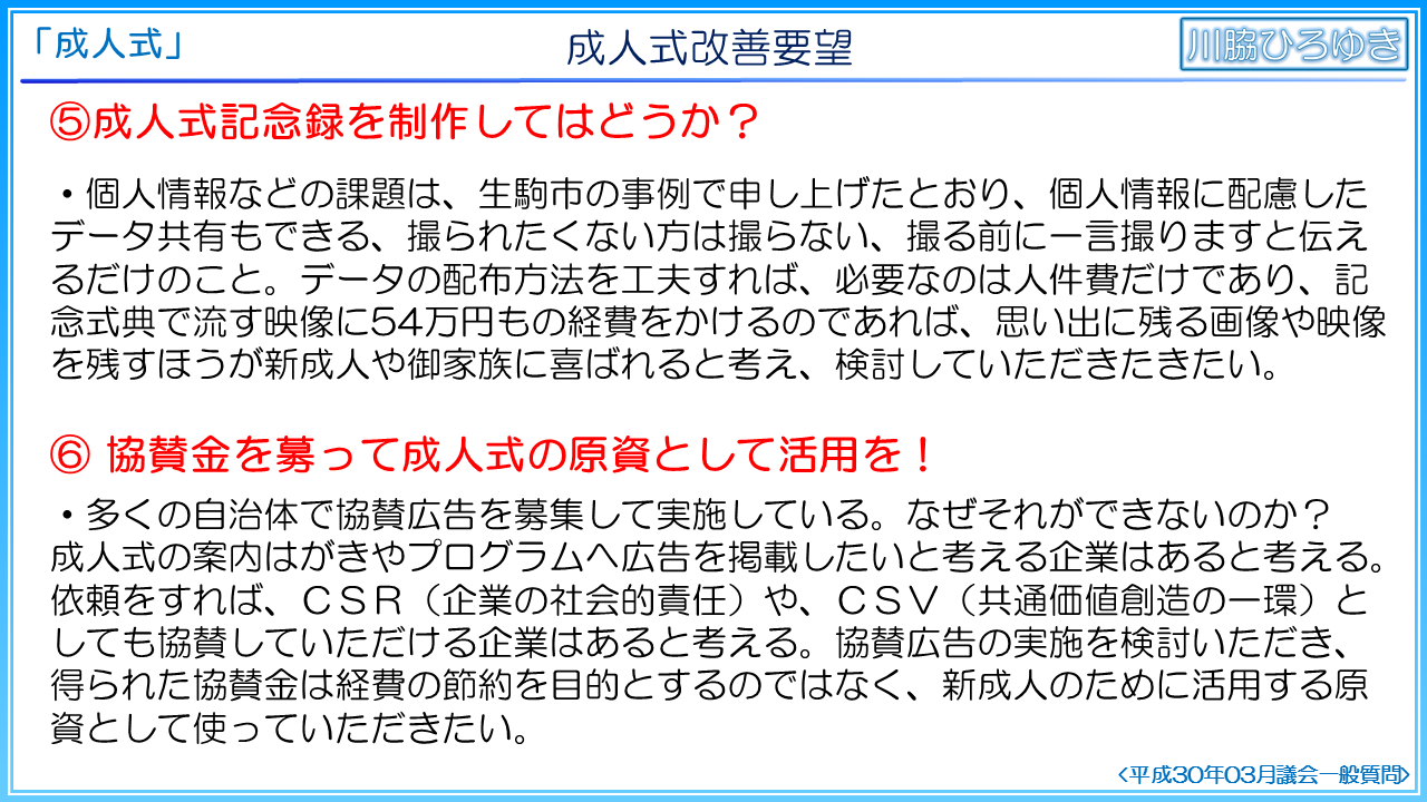 第6に、協賛金を募ることを要望いたします。多くの自治体で協賛広告を募集して実施しています。なぜそれができないのでしょうか。成人式の案内はがきやプログラムへ広告を掲載したいと考える企業はあると考えますし、依頼をすれば、CSR、企業の社会的責任や、CSV、共有価値創造の一環としても協賛していただける企業はあると考えます。協賛広告の実施を検討いただき、得られた協賛金は経費の節約を目的とするのではなく、新成人のために活用する原資として使っていただきたく存じます。