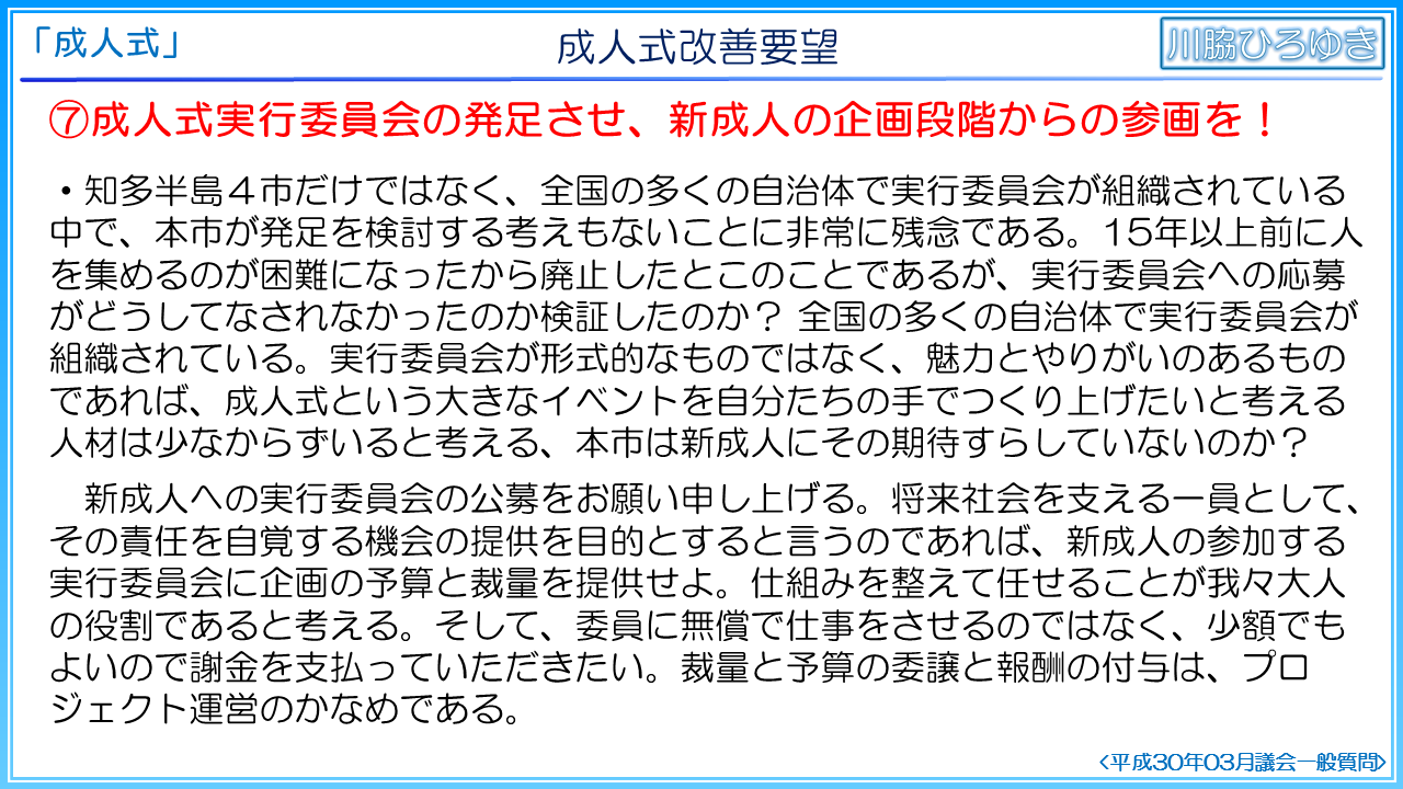 第7に、成人式実行委員会の発足と新成人の参画を提案いたします。本市を除く知多半島4市だけではなく、全国の多くの自治体で実行委員会が組織されている中で、本市が発足を検討する考えもないことを非常に残念に思います。15年以上前に人を集めるのが困難になったから廃止したとおっしゃいますが、実行委員会への応募がどうしてなされなかったのか検証したのでしょうか。全国の多くの自治体で実行委員会が組織されています。実行委員会が形式的なものではなく、魅力とやりがいのあるものであれば、成人式という大きなイベントを自分たちの手でつくり上げたいと考える人材は少なからずいると考えますが、本市は新成人にその期待すらしていないのでしょうか。